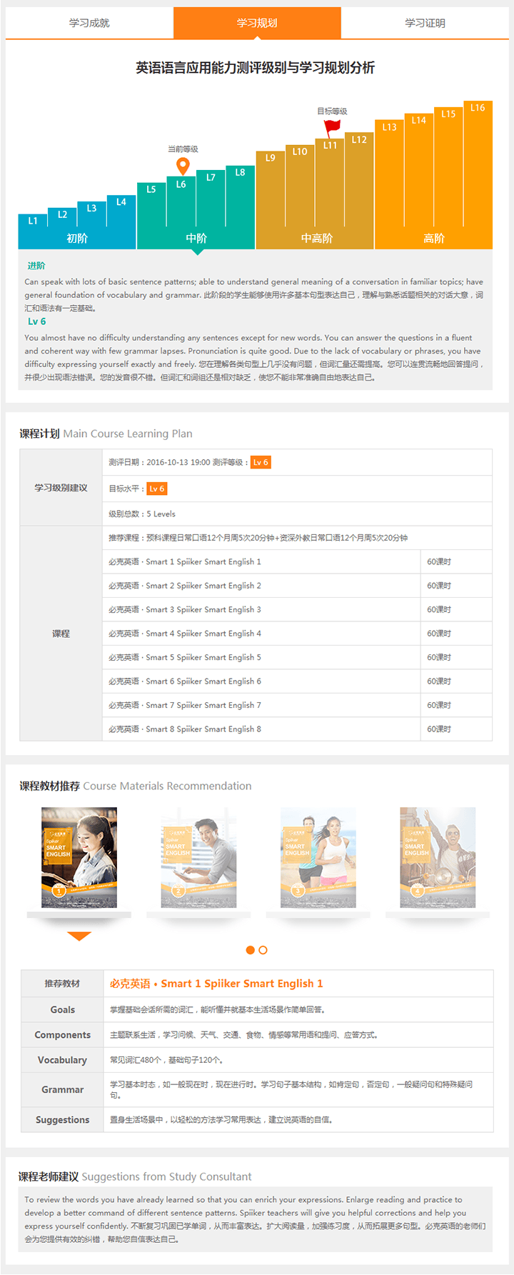 必克英语学习规划是以学员英语测评结果为基础,学员学习需求/目标为方向,由必克英语专业课程老师为学员量身定制的。“学习规划”作为量身定制课程的重要组成部分,由学习教材、学习方式方法、学习进度安排等因素构成,学习规划是否合理直接影响学员的提升效率。在必克英语,为了让每一位学员都达到“学有所成”的效果,每一个课程都与学习规划绑定。必克英语的定制专属学习由5个基本步骤构成:在线预约--专业测评--需求导入--课程方案(学习规划)--提升反馈。由此可见,需求导入与课程方案学习规划是后续学习的基础环节,按需定制必不可少。